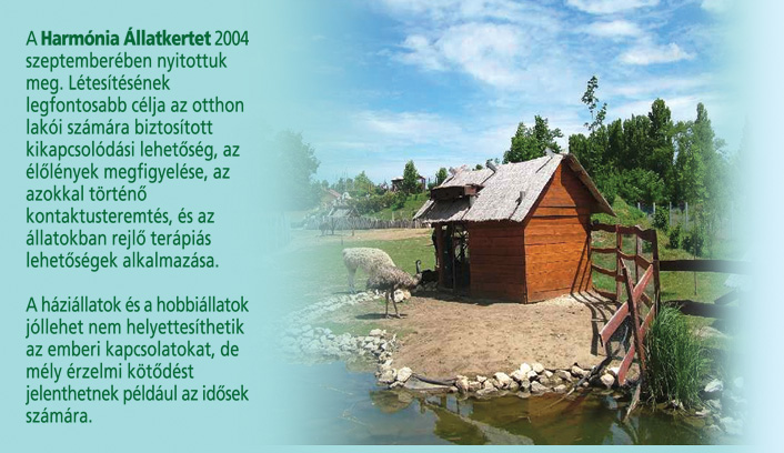 A Harmónia Állatkertet 2004 szeptemberében nyitottuk meg. Létesítésének legfontosabb célja az otthon lakói számára biztosított kikapcsolódási lehetőség, az élőlények megfigyelése, az azokkal történő kontaktusteremtés, és az állatokban rejlő terápiás lehetőségek alkalmazása.