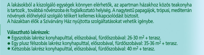 A lakásokból a kiszolgáló egységek könnyen elérhetők, az apartman házakhoz közös teakonyha is tartozik , továbbá nővérszoba és foglalkoztató helyiség. A nagytestű papagájok, trópusi, mediterrán növények élőhelyéül szolgáló télikert kellemes kikapcsolódást biztosít.