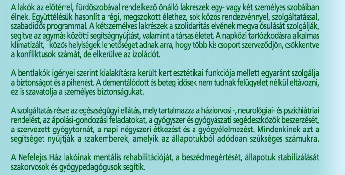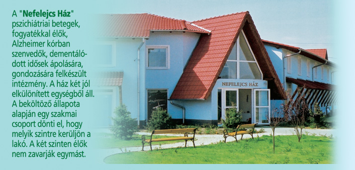 A "Nefelejcs Ház" pszichiátriai betegek, fogyatékkal élők, Alzheimer kórban szenvedők, dementálódott idősek ápolására, gondozására felkészült intézmény. A ház két jól elkülönített egységből áll. A beköltöző állapota alapján egy szakmai csoport dönti el, hogy melyik szintre kerüljön a lakó. A két szinten élők nem zavarják egymást.
