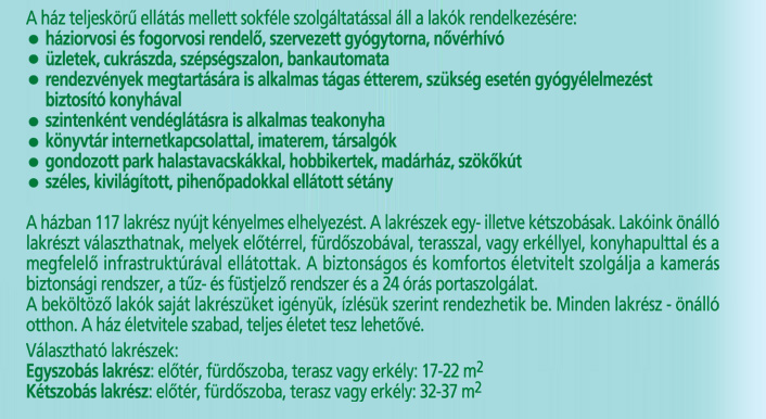 A ház teljeskörű ellátás mellett sokféle szolgáltatással áll a lakók rendelkezésére:
